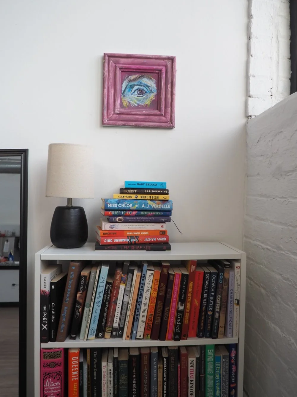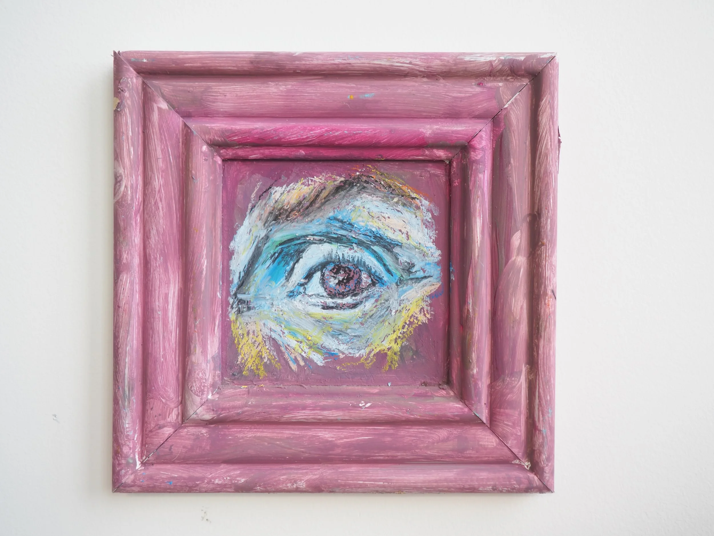 Oil Pastel on found canvas frame. 9x9”. 2023
